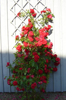 Dagens sista trädgårdssyssla blev att angöra dessa rosor intill väggen. Visst är de vackra? Normalt sett är jag ganska likgiltig inför blommor, men när det gäller exempelvis rosor så kan jag förstå hur en del människor blir alldeles lyriska inför åsynen av vackra blommor.